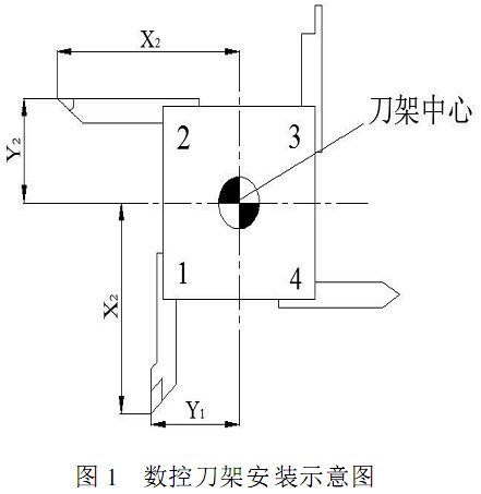 刀具位置尺寸補償?shù)膶嵸|(zhì)是將刀具相對于工件的坐標(biāo)由刀具安裝的定位點移到刀尖位置。以最簡單的四工位數(shù)控車床旋轉(zhuǎn)刀架為例,由圖1可以看出,刀具1 相對與刀架中心的坐標(biāo)為 X1 、Y1 ,刀具2相對于刀架中心的位置為X2 、Y2 ,因為數(shù)控車床刀具安裝系統(tǒng)的特性,即便是尺寸完全相同的兩把刀具安裝在同一臺數(shù)控機床的旋轉(zhuǎn)刀架上,其相對于刀架中心的尺寸也不可能完全相同,所以需要通過對刀操作以補償因為不同刀具相對于刀架尺寸不同而在換刀時出現(xiàn)的刀尖不重合的現(xiàn)象,簡言之,就是要通過車刀位置尺寸補償來使不同尺寸的車刀在同一個工件坐標(biāo)系的坐標(biāo)中運動。數(shù)控車床對刀設(shè)置的方法一般有試切對刀、機械對刀儀對刀( 接觸式)、光學(xué)對刀儀對刀( 非接觸式) 等。