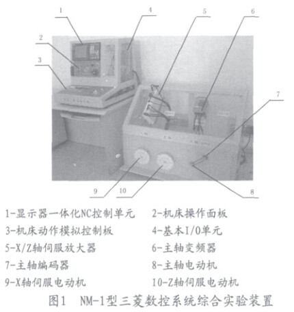 N M-1型三菱數控(車床)系統綜合實驗裝置主要是由先進的三菱E60 N C控制單元、基本I/O單元模塊、全數字伺服驅動單元和H F伺服電動機、主軸用無級變頻調速器和電動機、刀架電動機、機床操作面板和其控制機床模擬信號板以及運動執行臺等部分組成,具體如圖1所示。