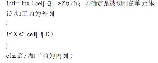 讀入經(jīng)過程序處理模塊得到的仿真驅(qū)動(dòng)信息,即刀具運(yùn)動(dòng)信息,得到車刀刀尖處的位置( X t ,Z t) ,根據(jù)Z t確定刀具經(jīng)過的小圓柱單元在工件數(shù)組中的位置,也就是確定哪個(gè)單元體被切削. 然后比較該單元體的直徑和刀尖點(diǎn)的X t坐標(biāo),確定該單元體是否被切削.具體的實(shí)現(xiàn)命令如: