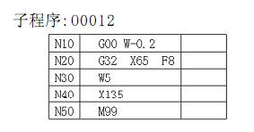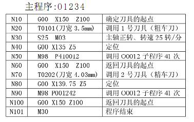 根據以上分析,用刀寬為端面矩形螺紋車刀,以右刀尖為對刀點,對圖(一)所示零件圖中數控車削端面矩形螺紋時所編制的程序如下表: