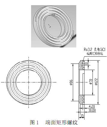 在普通車床加工的螺紋通常都是軸向的,但現在要加工的是比較少用的端面螺紋,且是非標準的矩形螺紋,故有其一定的技術難度,如圖1 所示是螺距為8mm 的右旋端面矩形螺紋的零件圖,材料為45號鋼。